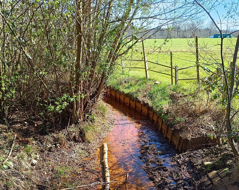 Auffällig ist die orangene Farbe des Wassers. Hierbei handelt es sich nicht etwa um eingebrachte Schadstoffe oder Ähnliches. Zu sehen ist eisenhaltiges Grundwasser, das aus Drainagen in den Bach strömt. Gelangt dieses eisenhaltige Grundwasser an die Oberfläche und kommt mit Sauerstoff in Berührung, entsteht Eisenocker. Der rostrote Eisenocker trübt das Wasser und verschlammt das Bachbett. Es folgt eine Verschlechterung der Lebensbedingungen für Gewässerorganismen.